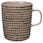 Marimekko-merkin Oiva/Siirtolapuutarha-muki hämmästyttävällä muotoilulla kivitavarasta pilkullisella kuvioinnilla ja kuumille juomille kuten kahville ja teelle täydellisellä kahvalla sivulla.