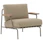 Lounge chair by Muuto with a sleek aesthetic with contrasting materials to create an interesting expression for an exclusive outdoor atmosphere. It has a slender frame in powder coated steel with soft cushions for optimal comfort and beautiful armrests in mahogany perfect for relaxed days.